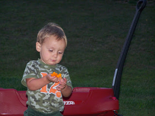 OUR LITTLE BOY IS GETTING SO BIG!!!!!!! He loves to be outside. We don't know what we are going to do this winter. He has just learned how to smell things and he loves to smell flowers. I was trying to get a picture of him smelling one but just could not get one. Landon also loves to ride on the lawn mower with his Dad.